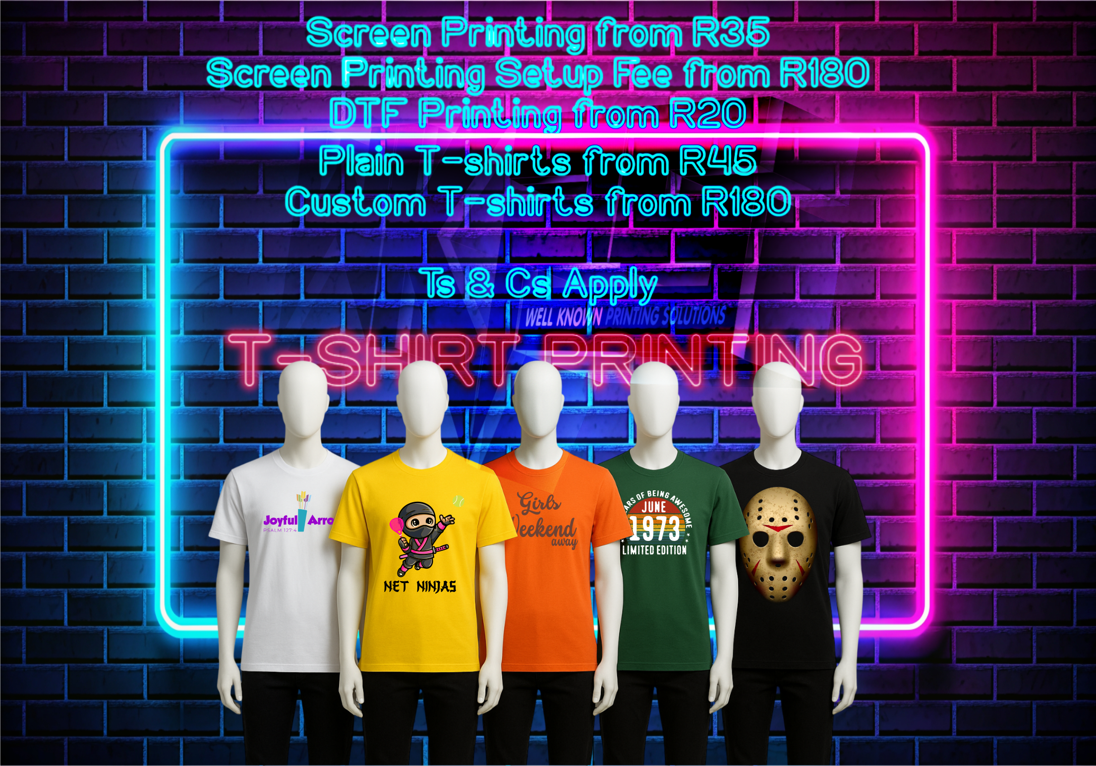 Well Known Printing Solutions has been in business for over 15 years and has done work with numerous individuals and companies such as Homemark, Disoufeng Pub & Restaurant, N.U.M.S.A., Blackbrain Productions (Lockdown on Mzansi Magic), to name a few. We pride ourselves in the quality of work we produce, accompanied with affordable pricing, and a turnaround time that can't be matched.We specialize in screen printing and supply of t-shirts, overalls, sweat tops, hoodies, golf shirts, corex boards, etc.