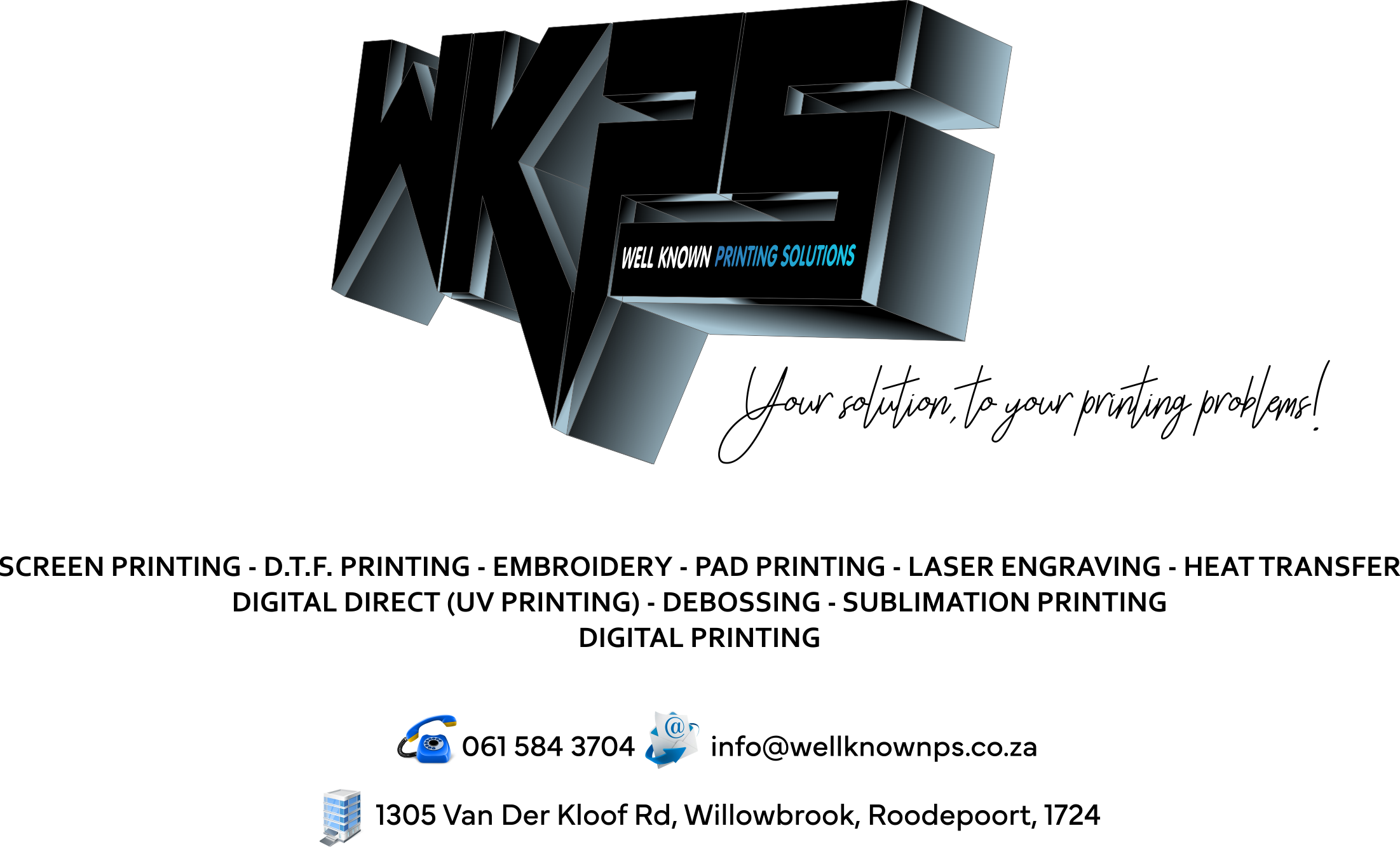 Well Known Printing Solutions has been in business for over 15 years and has done work with numerous individuals and companies such as Homemark, Disoufeng Pub & Restaurant, N.U.M.S.A., Blackbrain Productions (Lockdown on Mzansi Magic), to name a few. We pride ourselves in the quality of work we produce, accompanied with affordable pricing, and a turnaround time that can't be matched.We specialize in screen printing and supply of t-shirts, overalls, sweat tops, hoodies, golf shirts, corex boards, etc.
