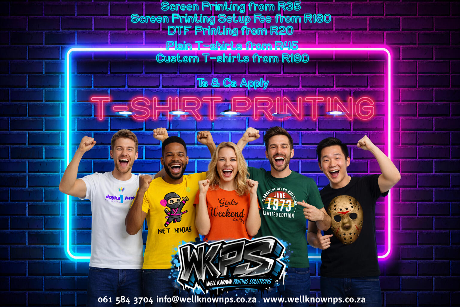 Well Known Printing Solutions has been in business for over 15 years and has done work with numerous individuals and companies such as Homemark, Disoufeng Pub & Restaurant, N.U.M.S.A., Blackbrain Productions (Lockdown on Mzansi Magic), to name a few. We pride ourselves in the quality of work we produce, accompanied with affordable pricing, and a turnaround time that can't be matched.We specialize in screen printing and supply of t-shirts, overalls, sweat tops, hoodies, golf shirts, corex boards, etc.